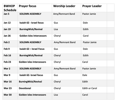 Burningwick House of Prayer (BWHOP) is a non-denominational gathering of believers that join together weekly at the Remnant Church Property, (4520 New Jesup Hwy Brunswick, GA ) to worship the LORD and to intercede and cry out to Him for the things that are on HIS heart. We meet on Thursdays from 7-9 pm, and welcome believers from all churches in the area. Our worship and prayer services are in a 'Harp and Bowl' style (from Revelation 5:6-8), where we combine continuous anointed worship with fervent prayer. Our schedule of worship watches is as follows: